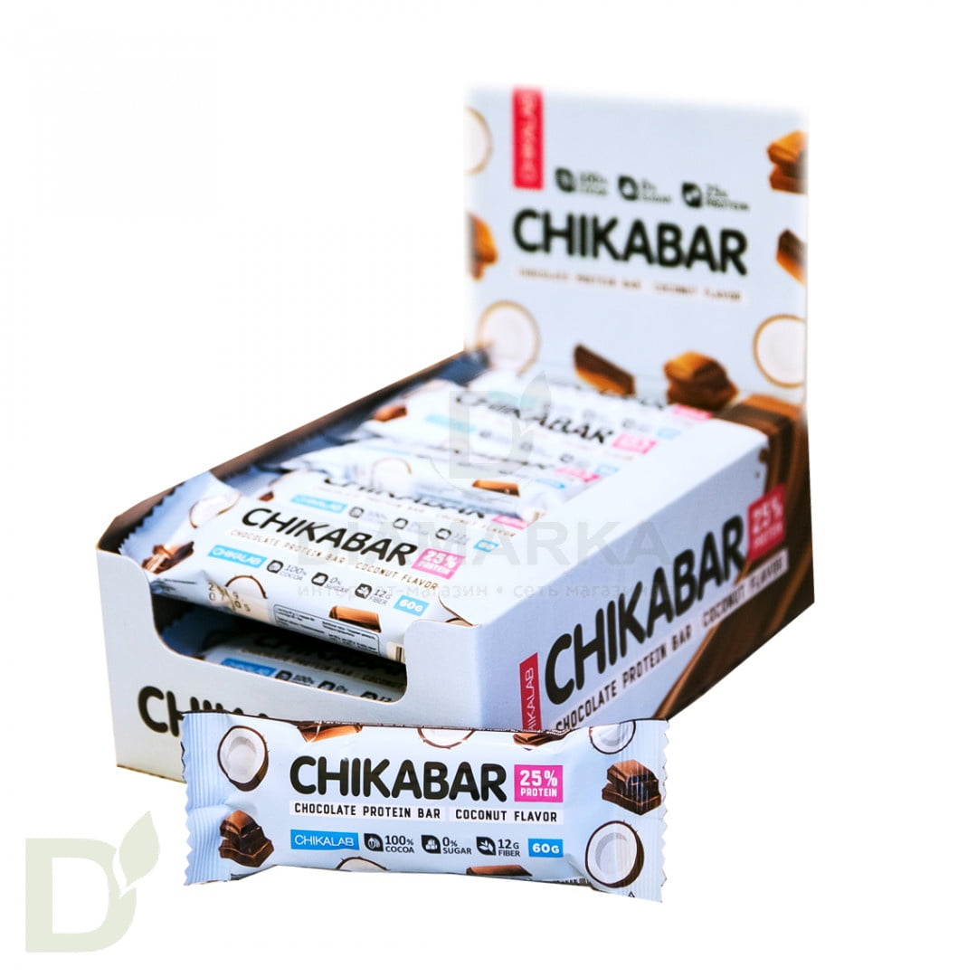 <b>Выбор снеков для перекуса - дело ответственное! Ведь хочется, чтобы было не просто вкусно и питательно, но и полезно..</b><br> <h2>Подобного вы еще не пробовали - знакомьтесь с новинкой Bombbar ChikaBar</h2> Протеиновые батончики Bombbar ChikaBar снаружи покрыты вкуснейшим молочным шоколадом, а внутри них спряталась нежнейшая начинка. Достойная замена обычным шоколадкам, конфетам, тортикам.<br> <h2>В 100 граммах протеинового батончика содержится 4, 7 грамма углеводов</h2> Батончики дополнительно обогащены пищевыми волокнами. А это правильная работа желудочно-кишечного тракта + замедление усвоения углеводов. Сплошная польза - с какой стороны не взгляни.<br> <h2>Состав протеиновых батончиков Bombbar ChikaBar</h2> белки молочные (концентрат сывороточного белка, концентрат молочного белка), водорастворимые волокна кукурузы, паста шоколадная белая (кокосовое масло, водорастворимые волокна кукурузы, изолят сывороточного белка, какао масло, молоко сухое обезжиреное, эмульгатор - соевый лецитин, ароматизаторы натуральные, антиокислитель (аскорбиновая кислота), подсластитель - сукралоза), молочный шоколад (водорастворимые волокна кукурузы, какао масло, какао тертое, молоко сухое обезжиренное, эмульгатор - соевый лецитин, ароматизаторы натуральные, подсластитель - сукралоза), масло кокосовое, вода, агенты влагоудерживающие (глицерин, сорбит), соль, ароматизаторы натуральные, регулятор кислотности - лимонная кислота, эмульгатор (соевый лецитин), антиокислитель (аскорбиновая кислота), подсластитель - стевиозид. Может содержать следы арахиса.<br> <h2>БЖУ и калорийность Bombbar ChikaBar на 100 грамм</h2> белки - 25, жиры - 18,4, углеводы - 4.7, пищевые волокна - 20, ккал - 325.<br> <br> <h2>Если вам кажется, что полезное не может быть вкусным, значит вам точно пора попробовать Bombbar ChikaBar</h2> <br> Вес одного батончика - 60 грамм.