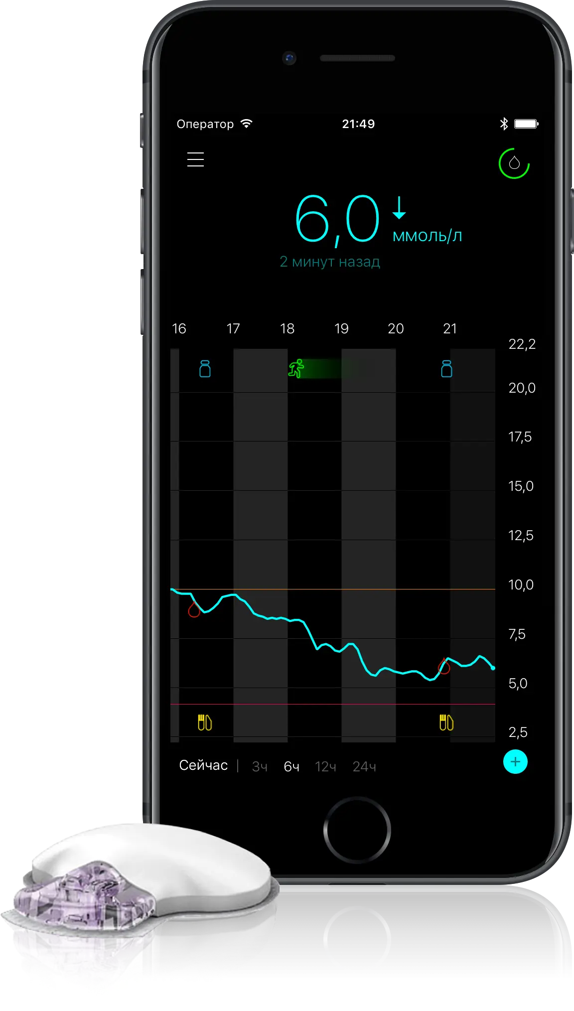 НМГ - это система, позволяющая отслеживать уровень сахара крови в режиме реального времени. Стандартная система НМГ состоит из: сенсора, передатчика и ридера/смартфона/умных часов и т.п. Таким образом, вы можете узнать уровень сахара крови моментально и без проколов: просто приложив ридер к сенсору или посмотрев на экран телефона.
