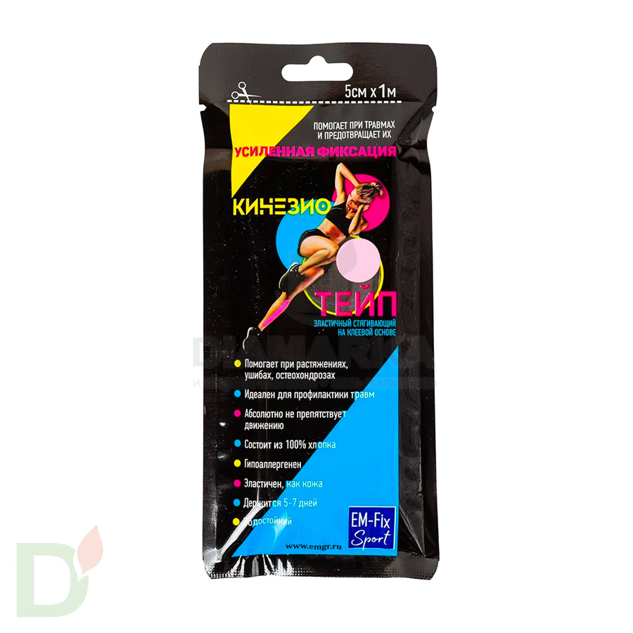 Кинезиотейп EM-Fix Sport стягивающий идеален для дополнительной фиксации канюль, сенсоров и трансмиттеров систем непрерывного мониторинга глюкозы крови, подов помпы ОмниПод. <br> <h2>Данный кинезиотейп сделан из 100-% хлопка</h2> ...а состав клеевой основы имеет гипоаллергенные свойства. Это значит, что кожа под тейпом будет дышать - раздражений и покраснений можно не бояться!<br> <h2>Преимущества тейпа EM-Fix Sport усиленной фиксации</h2> <ol> <li>позволяет коже дышать</li> <li> водостойкость</li> <li> эластичность</li> <li> гипоаллергенность</li> <li> стойкость до 7-ми дней!</li> </ol> <br> <br> Основное предназначение тейпа - снятие боли и напряжения в мышцах и суставах при травмах, ушибах и растяжениях. Тейпирование применяется при остеохондрозе, а также может использоваться для профилактики травм.<br> <h2>Состав тейпа EM-Fix Sport</h2> <b>Материал: 1</b>00 % хлопковая эластичная ткань.<br> <b>Связующий материал: </b>полиакриловый клейкий гель.<br> <b>Несущий материал: </b>бумага с силиконовым покрытием.<br> <b>Производитель: Испания</b>