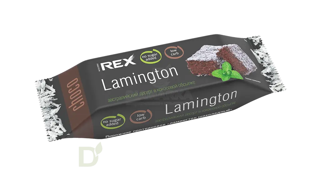 <h2>Вкуснейшее пирожное без сахара, лишних калорий и углеводов</h2> Все еще думаете, что диета - это скучно, пресно и невкусно? Только не с вкусняшками от Protein Rex. Protein Rex - настоящая находка для тех, кто соблюдает диету, не ест сахар и сахаросодержащие продукты, болеет диабетом, занимается спортом и просто соблюдает здоровый образ жизни.<br> <br> <h3>Диета без срывов - это реальность!</h3> Особенности и преимущества пирожных Protein Rex:<br> <ul> <li>в составе нет сахара, вместо него - низкокалорийный подсластитель нового поколения изомальт</li> <li> десерт обогащен пребиотиком</li> <li> пониженное содержание калорий и минимум углеводов</li> <li> натуральный и приятный вкус любимого десерта</li> </ul> Масса нетто: 50 грамм<br> <h3>Состав пирожного Ламингтон шоколадный</h3> протеиновый комплекс (белок яичный, концентрат молочного белка); стружка кокосовая; подсластители: изомальт, эритрит; масло кокосовое; изомальтоолигосахариды (пребиотик); масло растительное; вода питьевая; какао-порошок; мука пшеничная; желток яичный; мука миндальная; загустители: полидекстроза, крахмал модифицированный, каррагинан; молоко сухое обезжиренное; влагоудерживающий агент глицерин; эмульгатор лецитин соевый; разрыхлитель гидрокарбонат натрия (сода пищевая); соль; ароматизаторы натуральные; консервант сорбат калия.<br> <h4>Пищевая и энергетическая ценность на пирожное</h4> белки - 6,5<br> жиры - 13<br> углеводы - 8<br> пищевые волокна - 6<br> 190 ккал
