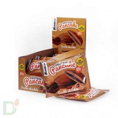 <h2>ПП-сладости для тех, кто на ЗОЖе. 25% белка</h2> Ароматные, нежные, манящие панкейки без сахара и с минимальным содержанием муки. Основа панкейков Бомббар - изолят сывороточного белка (протеин) и пищевые волокна. Такие панкейки и жажду сладенького утолят, и голод победят, и ЖКТ оздоровят!<br> <br> Что самое приятное, этот десерт практически не представляет опасности для уровня сахара крови, так как содержит рекордно малое количество углеводов. Однако будьте внимательны: люди с высокой чувствительностью к углеводам могут заметить более выраженный прирост сахара после панкейков!<br> <br> <b>Протеиновые панкейки Бомббар хороши в качестве десерта для людей с диабетом, тех кто на диете, спортсменов и адептов правильного питания.</b><br> <br> Вес панкейка - 40 грамм<br> Срок годности - 12 месяцев<br> <h2>Состав панкейка Двойной Шоколад</h2> изолят сывороточного белка, продукты яичные (меланж яичный), изомальтоолигосахарид, начинка со вкусом шоколадного крема (олигофруктоза (пищевые волокна из цикория), вода, изолят молочного белка, сыворотка сухая деминерализованная, масло кокосовое, какао-порошок, агент влагоудерживающий (глицерин), загуститель (ксантановая камедь), ароматизаторы натуральные, антиокислитель (аскорбиновая кислота), соль, подсластитель (сукралоза), консервант (сорбат калия)), вода, подсластитель (эритрит), растительное масло, пшеничная цельнозерновая мука (содержит глютен), какао-порошок, агент влагоудерживающий (глицерин), подсластитель (сорбит), регуляторы кислотности (лимонная кислота, гидрокарбонат натрия (сода пищевая)), сыворотка сухая деминерализованная, соль, ароматизаторы натуральные, антиокислитель (аскорбиновая кислота), подсластитель (сукралоза), консервант (сорбат калия).<br> <h2>Пищевая и энергетическая ценность на 1 шт</h2> б 10<br> ж 5,3<br> у 2,7<br> клетчатка 5,9<br> ккал 110